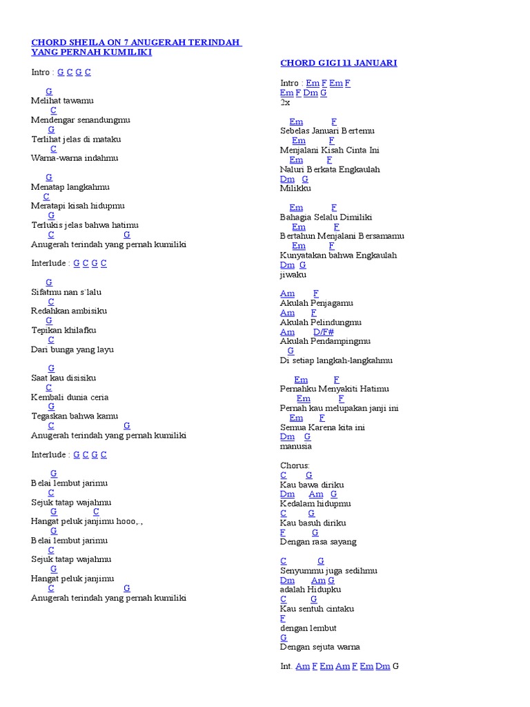Chord sheila on 7 dan. Choose and determine which version of yang terlewatkan chords and tabs by sheila on 7 you can play. C f g kita dipertemukan. Jika ada sebarang masalah tentang chord lagu diatas sila buat aduan pada form report chord yang disediakan.report chords. verse: g c kemana kau slama ini g d bidadari yang ku nanti em a mengapa baru sekarang c f g kita dipertemukan. Best version of yang terlewatkan chords available. G c kemana kau slama ini g d bidadari yang kunanti em a mengapa baru sekarang c f g kita dipertemukan. G c desal takkan ada arti, g d karena semua tlah terjadi, em a kini kau tlah menjalani dudu dudu du. Here you can post a video of you playing the yang terlewatkan chords, so your fellow guitarists will be able to see you and rate you. G c kemana kau slama ini, g d bidadari yang kunanti, em a mengapa baru sekarang. Nama sheila diambil dari bahasa celtic yang artinya musikal. G d/f# mungkin salahku melewatkanmu em d tak mencarimu. Chords ratings, diagrams and lyrics.